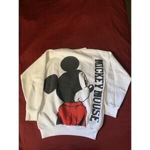 This vintage 1980s Mickey Mouse sweatshirt, licensed by Disney, features an all-over design of the iconic character. The sweatshirt is a size medium and is suitable for adults, with a white color and unisex appeal. Made in the United States as part of the Disney franchise, this collectible apparel piece is a nostalgic and stylish addition for any Disney fan or lover of classic Mickey Mouse merchandise.