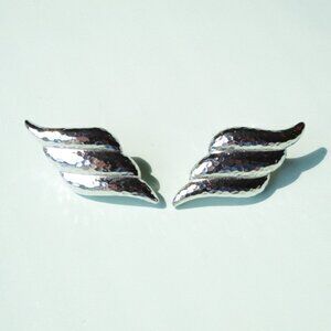 Make a bold statement with these striking 1980s Monet clip-on earrings! Designed in a dramatic abstract wing shape, these oversized beauties shimmer with a hammered texture and curving silhouette that feels both retro and timeless. Perfect for lovers of sculptural jewelry and vintage glam.