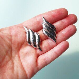 Vintage 1980s Monet Abstract Wing Earrings – Oversized Silver Tone Clip-Ons