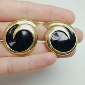Vintage 1980s Monet Black Enamel Gold Tone Clip On Statement Earrings, Estate