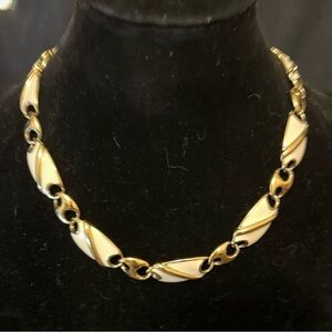 This vintage 1980’s Monet gold necklace features a timeless enamel and gold pattern, with that create a bold statement. Its polished finish enhances its lustrous appearance, making it a standout piece for your collection. This is such a classic design of very high quality materials. Even despite its age, it shines through & through the years to come. This is a timeless classic that will always be on trend. Amazing piece of jewelry for everyone that loves vintage jewelry.