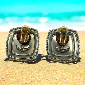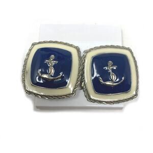 Vintage 1980's Navy Enamel Anchor Square Earrings Clip On Nautical Yacht Boating