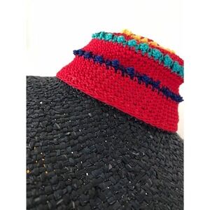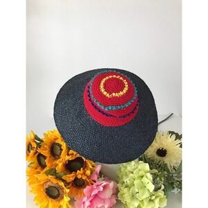 A unique hat, made with a crochet crown in a thick rope, with blue, teal and yellow stripes. The brim is made with a woven blue straw. The crown is stitched on with a grosgrain ribbon hat band. I do not know if this is a custom made hat, but it seems it's possible the original owner combined two hats to make this one. Very fun and unique. Hat band measures about 21.5".