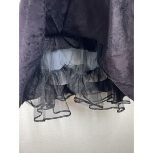 Tulle lining. Sequin lace trim with off the shoulder sleeves. Back zip closure. Ruched short sleeves.