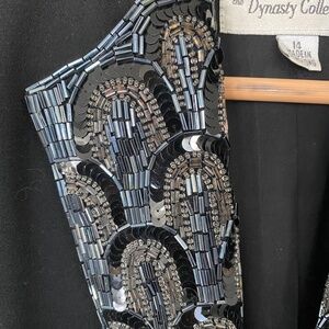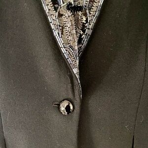 Classic strong-shouldered 100% wool jacket, fully lined, with intricate art deco beading on the lapels. No holes, discoloration or damage.