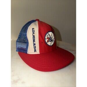 The hat is red, white, and blue, with the Philadelphia 76ers logo on the front and the word "PHILADELPHIA" embroidered on the side panels.