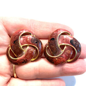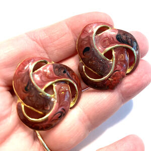 Vintage 1980’s Pierced Earrings - Chunky Boss Lady look pushbacks done in goldtone metal with a rose pink swirl enamel finish. Infinity knots design - no hallmarks - nice quality fashion jewelry. In excellent vintage condition - minor surface wear - no damage or flaws - very chic!