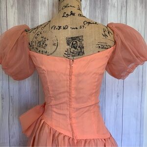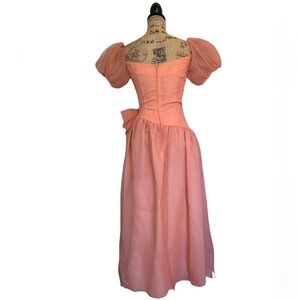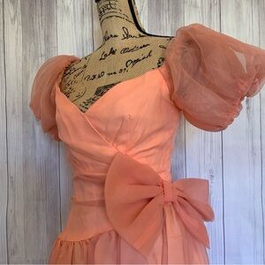 Description: solid pink puffy prom dress with a large bow. It has large puffy sleeves, a sweetheart neckline, a bow, and a full length or tea length skirt. Union made in the USA. No size tag, please see measurements