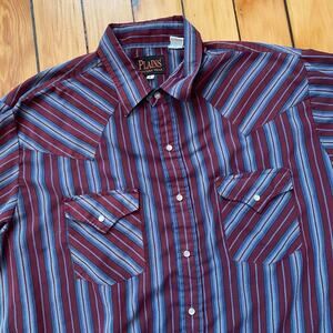 Vintage 1980s Plains Western Wear pearl snap button-up shirt. Great broken-in condition, nice fade small hole in one sleeve. Tagged L, measures 24.5 pit-to-pit and 31” top to bottom