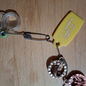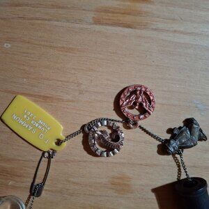 Vintage 1980´s charms on a chain necklace (held together by a safety pin). Very nice, good condition and it´s for a smaller child neck, I guess one could also make it smaller into an ankle or bracelet.