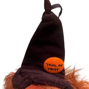 1988 Plush Creations Halloween-themed monkey stuffed animal. This adorable orangutan plushy features wild orange-brown fur, a festive black witch hat with a “Trick or Treat” button, and a spooky spiderweb necktie.