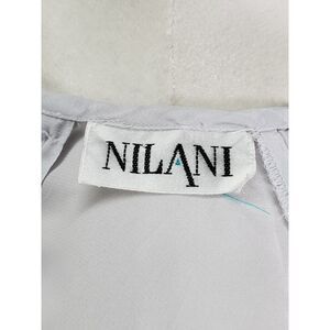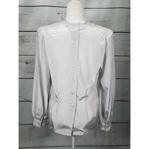 Beautiful, excellent condition long sleeve Nilani blouse, gray with a satin feel and look. Buttons down the back, pintucks at the waistline. Floral and butterfly embroidered neckline. Puff sleeves with button cuffs. Size is not marked. Please see measurements!