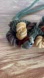 Colors include a forest green, cranberry red, mocha brown, gold and mustard yellow with triangle wooden pendant decorated with abalone shell pieces. Hook is slightly tarnished.