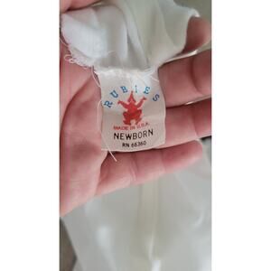 Adorable vintage Rubie’s “Jama Costumes” Bunny outfit for newborns (size 3–9 months). Made in the USA and part of Rubie’s unique “Jama” line — a fun combination of pajamas and costume wear. Flame-retardant white fabric with a pink belly patch and matching bunny ear headpiece.