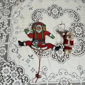 Santa wooden pull string jumping jack ornament. 8”. Vibrant colors. It has some very minor scuffs, but it is in its original unsealed bag and is in excellent condition.