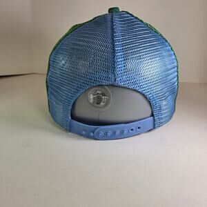 Authentic vintage Shakespeare fishing trucker hat from the 1980s. Features blue front panels, green bill, green mesh back, and embroidered patch logo in blue, green, and white. Adjustable snapback closure, size Small/Medium, Made in USA. The foam backing inside has degraded (common in hats of this era), but the outside still displays well. A great collectible cap for fishing enthusiasts or vintage hat collectors.