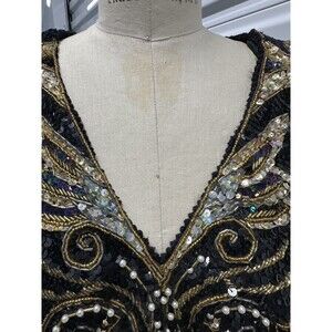 This stunning vintage 1980s sweater by Side Effects is a luxurious blend of angora, lambswool, acrylic, and nylon, offering both warmth and softness with a touch of glam. The V-neckline is beautifully adorned with an intricate floral and leafy design, cascading down the shoulder in a dazzling display of aurora borealis sequins, gold beads, and pearls.