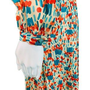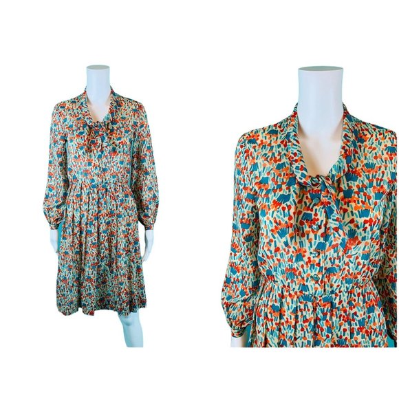 Vintage 1980s Silk Shirtdress Necktie Red Orange Blue Artistic Printed Dress