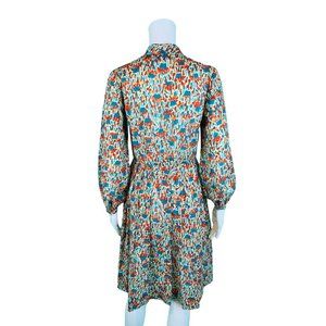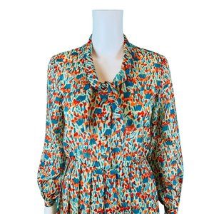 A vintage 1980s printed dress in a silky feeling material, with necktie, cool buttons down to the waist with a half zip to the waistline, an artistic brush stroke kinda print in red, orange, blue and turquoise on a cream background with long sleeves.