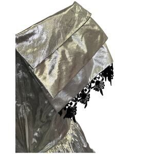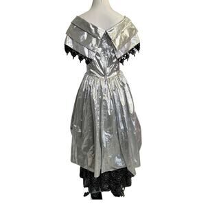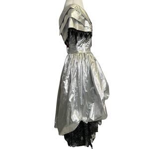 Vintage 1980’s silver metallic foil lamé gown. This metallic moment includes black lace fabric in the skirt. This dress serves a metallic southern Belle vibe wirh the potential to add underpinnings to the skirt to add volume. Off the shoulder silhouette is trimmed in black lace details. The bodice has a black beaded appliqué to complete the designer over the basque style waist. No interior designer/brand tag. 1980’s high/low hem detail.