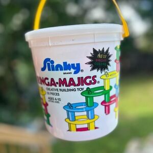 Bring back classic playtime fun with this vintage Slinky Ringa-Majigs Creative Building Toy set. Comes in the original plastic storage bucket with handle and lid. Includes 50 brightly colored interlocking pieces that encourage creativity, problem-solving, and open-ended building for kids ages 4–10.