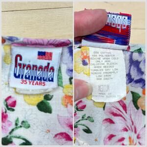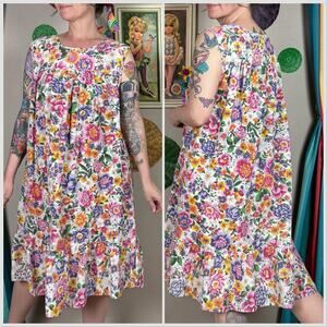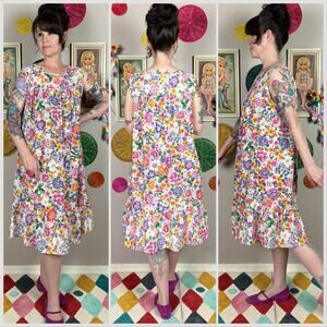No summer is complete without an 80s easy breezy grandma house dress! This one features a scoop neckline, short sleeves, airy a-line fit and a ruffled hem. Also has a single hip pocket. Comes in white with a colorful garden floral print. Made from a lightweight woven cotton material. These are also cute belted for a more fit and flare style.