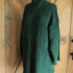 Classic vintage green chenille turtleneck sweater from about the 1980s. Long tunic style, it's perfect over leggings and boots. Or toss it over a maxiskirt with a belt for a witchy look. Label reads: Kenzo Paris. Acrylic and wool blend. Probably in the medium to large range and there is a size tag that says 3, but its really quite flexible for a variety of sizes. See measurements below.