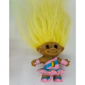 "Vintage 80s Troll Dolls Set: This collection features two iconic troll dolls from the 1980s. One measures 3" tall, crafted from flexible rubber with green hair and minimal clothing, stamped with 'Uneeda Doll Co.' on the back. The other is a 1.5" mini troll, made of hard rubber, dressed as a ballerina with a name on the skirt. Perfect for collectors of nostalgic toys, these charming dolls evoke memories of a bygone era."