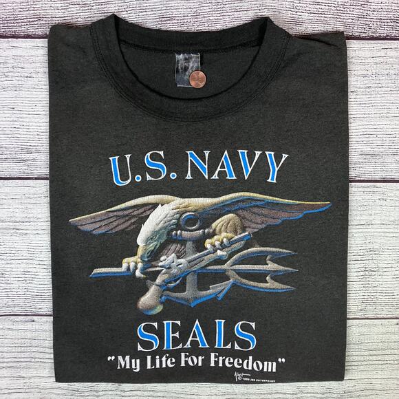 Vintage 1980s U.S. Navy Seals "My Life for Freedom" T-shirt in 8/10 condition due to a nice fade shown throughout. Very thin & soft / single stitch. Men's size XL, measurements are shown in pics. Always willing to do lower pricing on bundle deals.