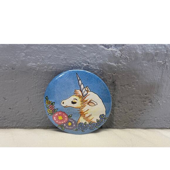 Blue background with the image of a unicorn stopping to smell the flowers on a metal pin back coated in plastic.