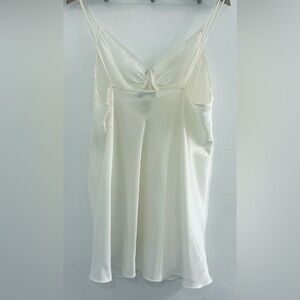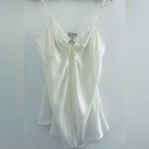 Vintage 1980’s Val Mode Chic White Satin Slip/Camisole (depending on height and how you chose to wear and style it) with delicate lace trim and rose details. Adjustable straps. Perfect for layering or wearing alone. Starting in the 1940’s Val Mode was renowned for its beautiful slips, nightgowns and bridal sleepware. This is a beautiful vintage piece for something old at a wedding or wedding night, or as a layering piece for a night on the town. No rips tears etc - two tiny marks as shown close up in pictures, barely visible to naked eye. Sealed, stored, and shipped in cellophane garment bag shown in pictures. • 100% Nylon Shell • 100% polyester details • Machine wash warm, tumble dry low • Pit to Pit 19” laying flat • Lace bodice to hem 27” laying flat (the straps are adjustable so will be longer depending on how the strap is made so I didn’t measure from top of strap to hem) (BA1)