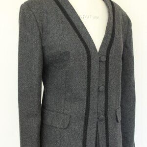Classy vintage Gray wool blend skirt and jacket suit. Jacket has shoulder pads, black braided trim and three interesting buttons up the front. Skirt is pencil shape with gathers at the waist in front and two side pockets. It has a back slit and a zipper and button in back. Label reads: Russ, and gives a size 8 but do see measurements below. Wool poly blend.