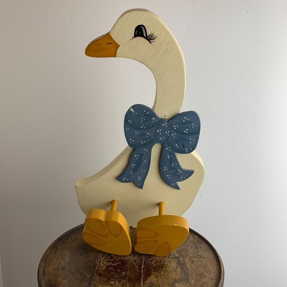 Vintage 1980s Wooden Hand Painted Sitting Apx. 14" White Duck Goose w/ Blue Bow