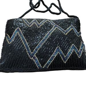 Vintage 1980’s black & iridescent blue beaded evening bag with goldtone beaded highlights. This purse is a shoulderbag style with woven satin strap and mod geometric bead design on both sides. Top zipper - black satin interior - no tags or hallmarks. In excellent condition - might be new old stock - just stunning!