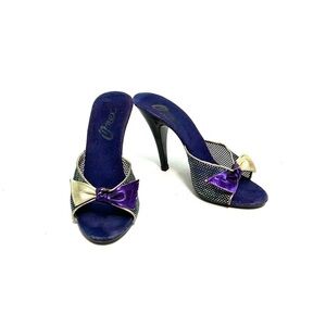 Vintage 1980s purple and gold iridescent rainbow polly style bow heels by Onex. Features iridescent rainbow netting vamp with metallic gold and purple bow, open toe, slip on polly style, purple suede insole, and black plastic cone heel. Very good vintage condition with light overall wear.