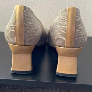 Vintage Stuart Weitzman heels from the 1980s or 1990s. Textured cream-colored fabric upper with leather insoles and gold leather detailing along the bottom and heel. Square heel and square toe.