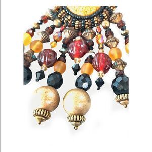 Vintage petrified wood center stone graces this elaborate one of a kind hand crafted 1980’s brooch by Sonoma jewelry artist Lisa Jo Silberkleit. New old stock this beautiful brooch has glass beaded bezel, with long dangles of Swarovski crystals, red glass fluted beads, gold beads, ox gold findings, measures 5” x 2’, wear as a pin, or attach to necklace , stunning unique item, please see all photos for full description.