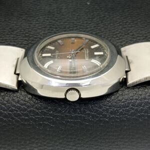 This watch has a stainless steel Case in great condition and almost no flaws. The face features Silver accents on a Brown Face giving an awesome vintage look overall. It also has a date function!