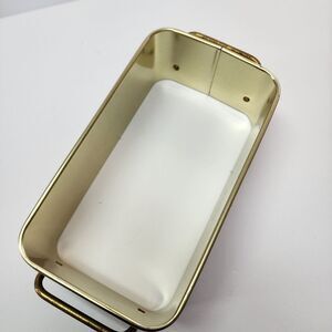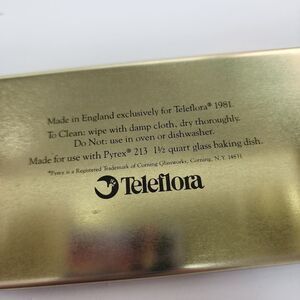 Intage 1981 Teleflora England Harvest metal holder with a Pyrex 213 1.5-quart loaf baking dish, The holder is made of metal, and the dish is made of Pyrex glass. The metal holder features a harvest fruit design. Vintage Pyrex made before the late 1980s is made of borosilicate glass, while newer versions are made of soda-lime glass. no chips or cracks