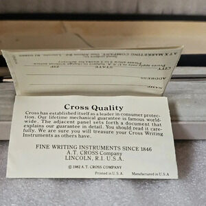 This vintage 1982 Cross ballpoint pen boasts a sleek chrome trim and is made of durable metal. It is a great addition to any pen collection and comes with its original box and paperwork. The pen was manufactured in the United States and has not been modified. It is a perfect choice for those who appreciate vintage items and is a must-have for any pen enthusiast.