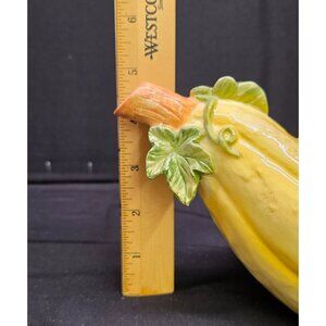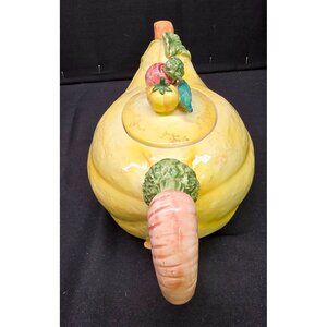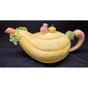 This is a vintage Fitz and Floyd ceramic teapot. Part of the "Vegetable Garden" collection. Bottom is marked FF 1982 36oz Japan. Shaped like a yellow squash with a carrot shaped handle, and a lid with sculpted vegetables. Teapot is hand painted. Approx 5" tall, 6" wide, and 11" long. Preowned with minor signs of wear. No chips or cracks noted. Please review photos as a part of the description.