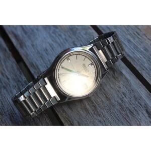 Vintage 1982 Seiko Automatic Mens Silver Watch W/daydate & Black accents