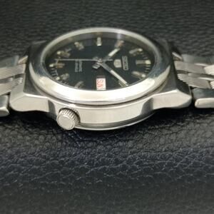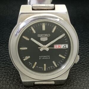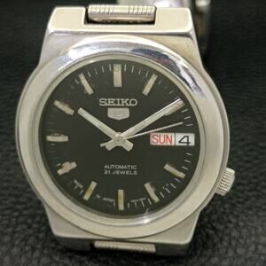 This watch has a stainless steel case in great condition with almost no flaws. The face features Silver accents on a Black Face giving an awesome vintage look overall. It also has a date function!