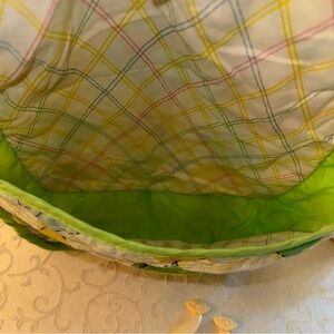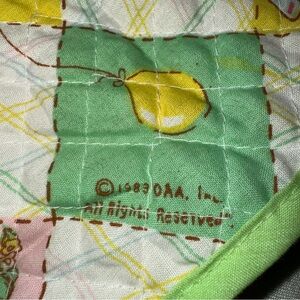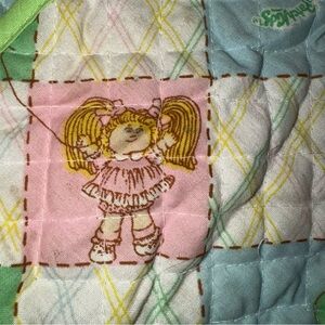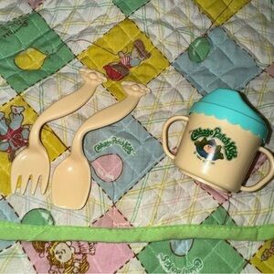 Vintage 1983 Cabbage Patch diaper bag, sippy cup, fork and spoon. Diaper bag is approximately 10” x 12” with a strap, interior pockets and a fold over flap. Sippy cup has removable lid. Excellent condition, no stains or holes.