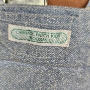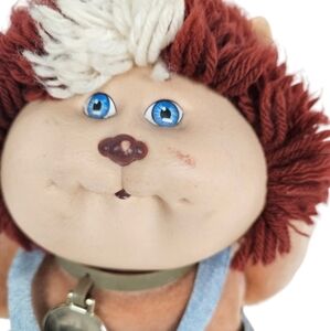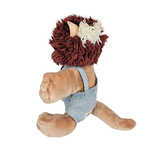 Travel back to the 80's with this vintage Koosas Cabbage Patch Kids toy. Made to be a pet for Cabbage Patch Kid dolls, these stuffed animal toys have a soft body and plastic head. This Koosas is a Lion Cat with yarn hair in brown and white with plastic ears. The plush body is tan. It is wearing denim overalls. It has a plastic gold collar.