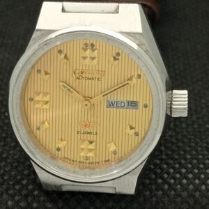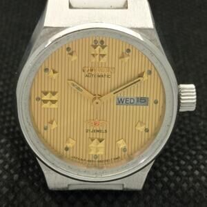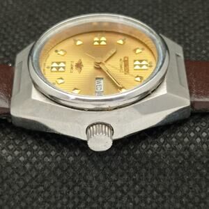 Stainless Steel Case in great condition and almost no flaws. The face features Gold accents on Textured Face giving an awesome vintage look overall. It also has a date function!