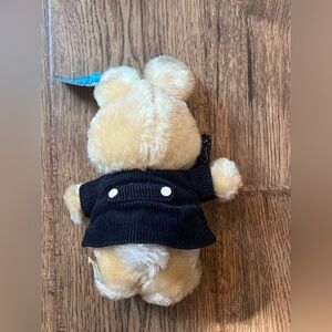 Adorable plush bunny wearing a black jacket with white buttons. Perfect for cuddling or as a gift.