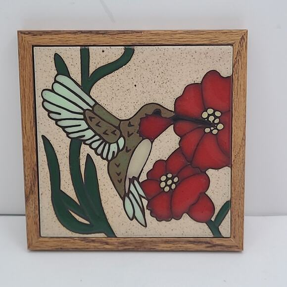 Vintage 1983 Fiesta Tiles Hummingbird Flowers Ceramic Tile in Wood Frame 7"x7"