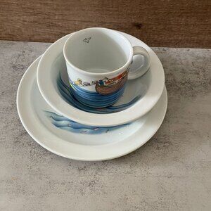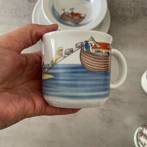 Full set includes an 8" dinner plate, 2.75" handled cup, 6.25" bowl all featuring the Noah's Ark pattern designed by Penny Ives for Royal Worcester.