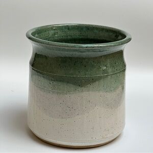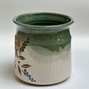 Handmade stoneware utensil holder signed and dated 1983. Features earthy green and cream glaze with hand-painted leaf and floral design. Marked “Utensils” on the front. Perfect for kitchen storage or as a decorative piece.